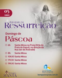 Neste Domingo de Páscoa, 5 de abril, a Paróquia Bom Pastor Praia da Costa realizará a primeira celebração do dia da Missa da Ressurreição nas areias da Praia de Itapuã, ao nascer do sol, às 6 horas, na Orla da Praia (na direção da Rua Jair de Andrade, em Itapuã). A Missa da Ressurreição será presidida pelo bispo auxiliar da Arquidiocese de Vitória, dom Anderson Franklin Lustoza de Souza.